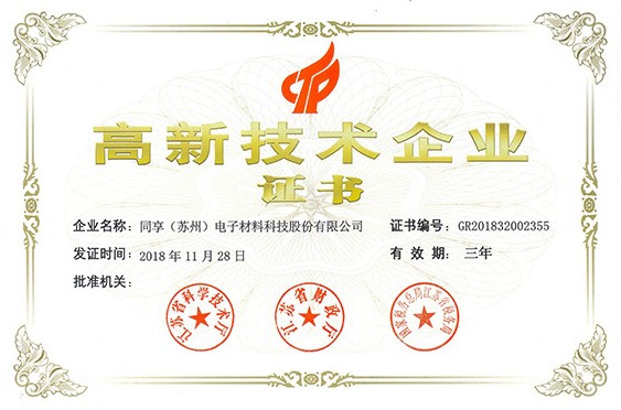 2015年7月,同享(蘇州)電子材料科技有限公司榮獲“高新技術企業”證書,該證書由蘇州市科學技術委員會、蘇州市財政局、蘇州市國家稅務局和蘇州市地方稅務局共同頒發,有效期三年。近年來,其同享技先后獲得了"吳江經濟開發區會員單位"、"吳江經濟開發區副會長…