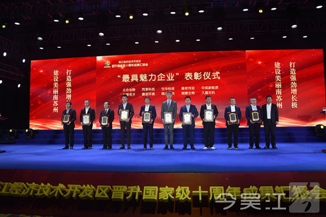 2020年11月10日上午,吳江經(jīng)濟(jì)技術(shù)開發(fā)區(qū)晉升國 家級十周年成果匯報會舉行。會議總結(jié)十年來吳江經(jīng)濟(jì)技術(shù)開發(fā)區(qū)發(fā)展取得的豐碩成果,展望未來發(fā)展的光明前景并在會議中表示開發(fā)區(qū)十年來的高質(zhì)量發(fā)展取得的成果,離不開廣大企業(yè)和企業(yè)家的傾情付出,同享科技榮獲“最 具魅力企業(yè)”的稱號。